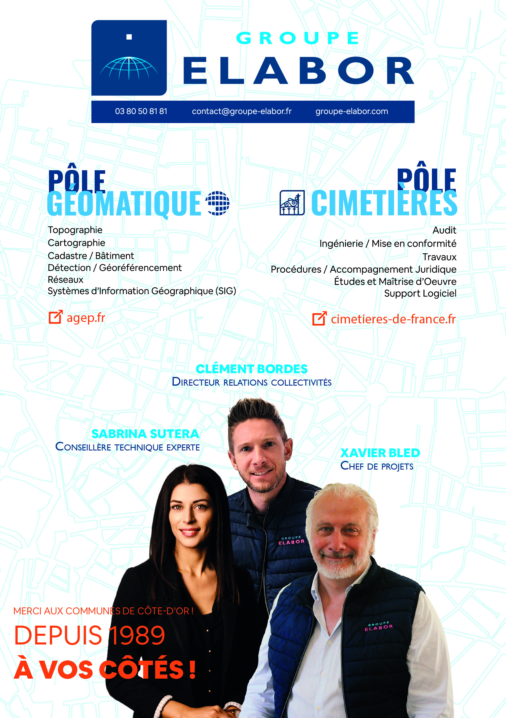 GROUPE ELABOR est un bureau d'études spécialisé dans l'aménagement des territoires, l'ingénierie (géomatique et cimetière), l'expertise (technique, juridique et technologique) et le conseil, qui travaille depuis 36 ans, pour et dans l'intérêt des collectivités territoriales.